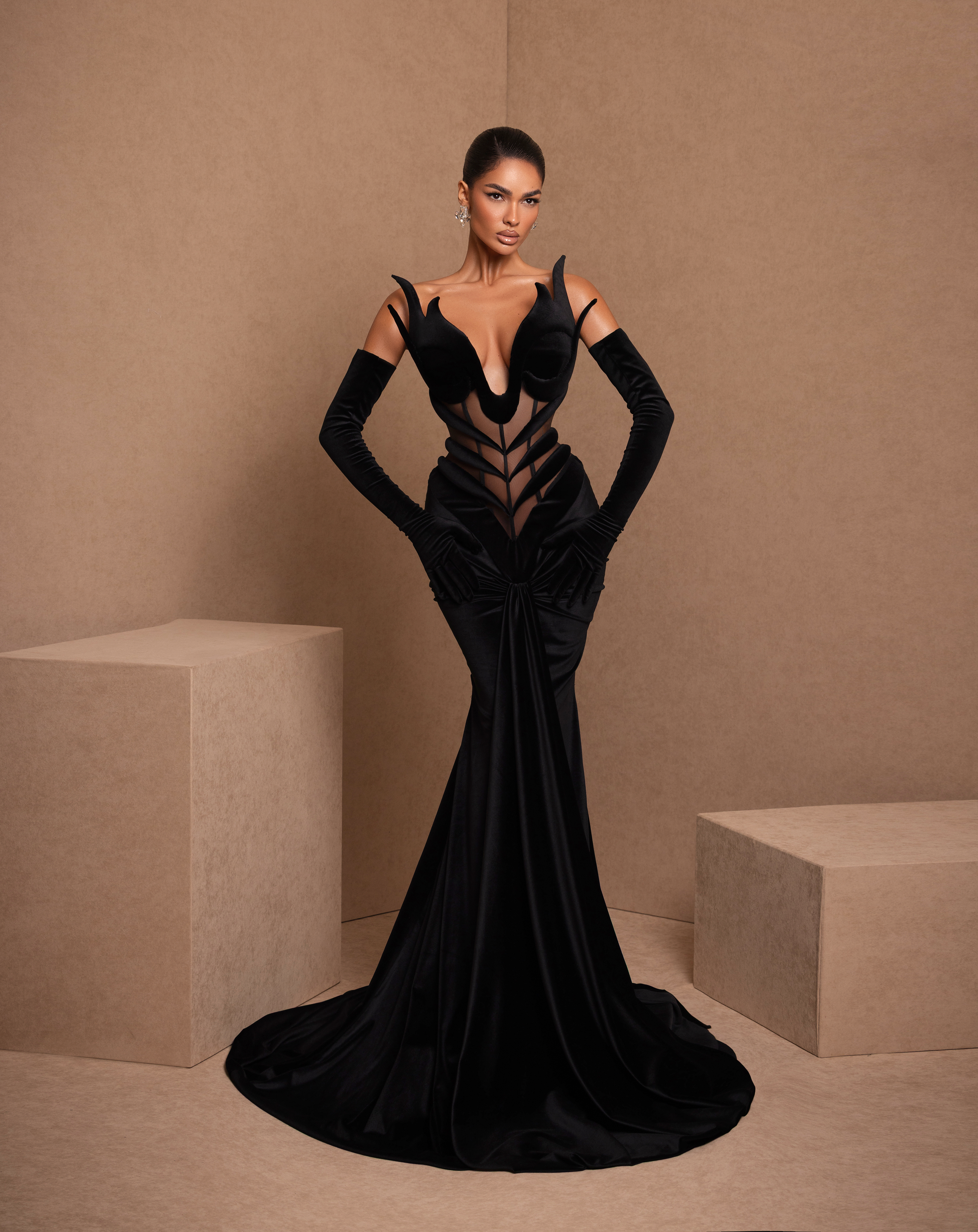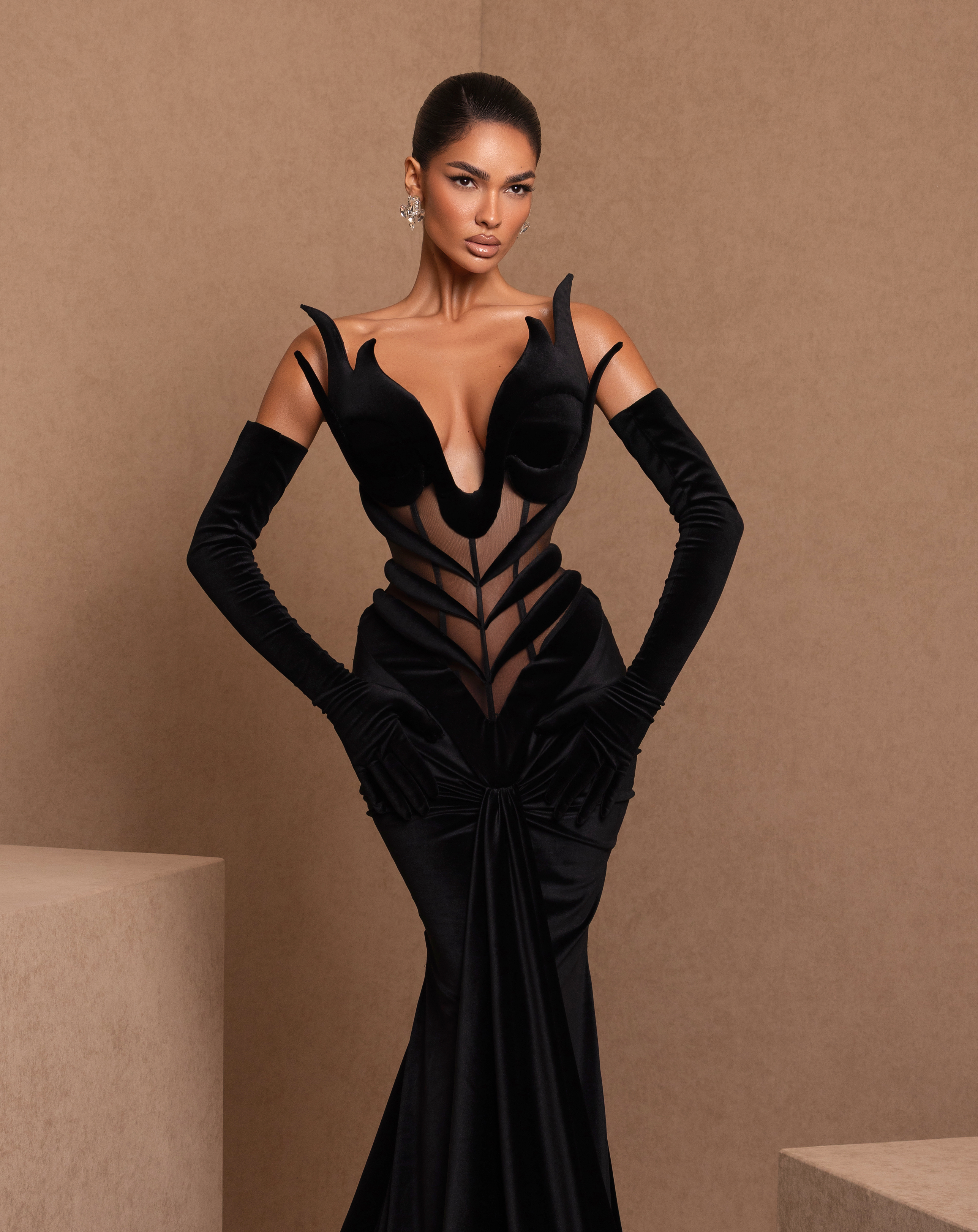 Velvet mermaid dress featuring a 3D-structured with a mesh and tulle